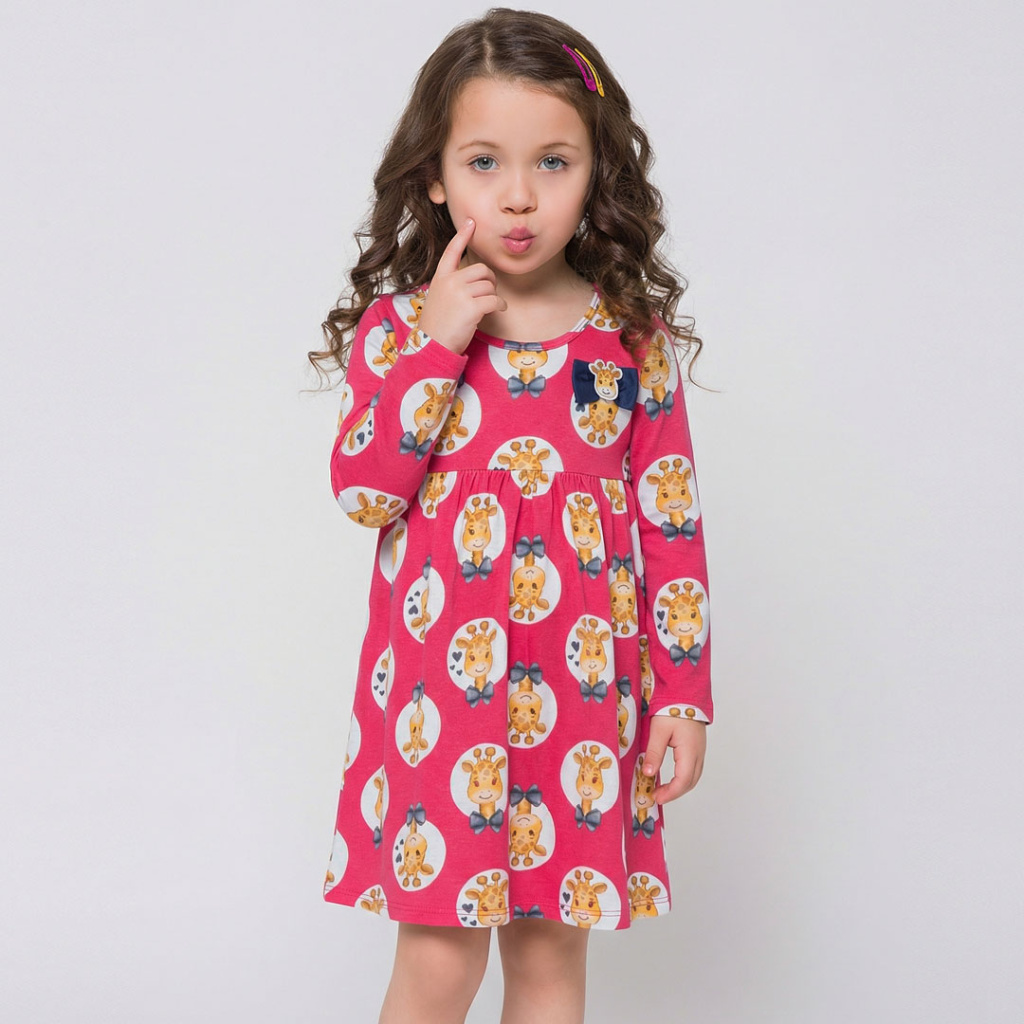 Krásné šaty s dlouhým rukávem. Veselý potisk žirafek a našitá mašlička. Kulatý výstřih, nařesení pod živůtkem. Příjemný bavlněný úplet. Vyrobeno v Brazílii.