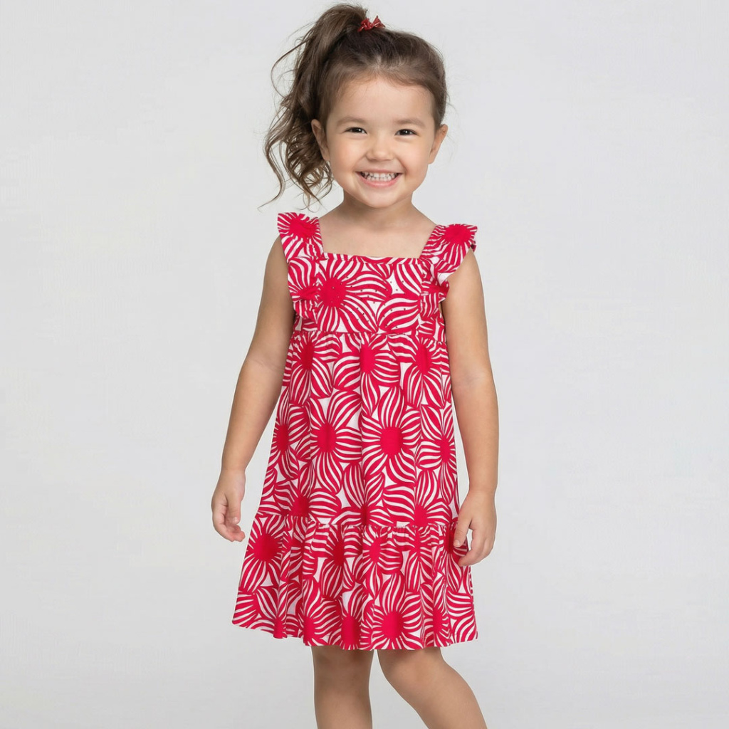 Dívčí letní šaty. Bez rukávů, pohodlný, rozšířený střih, dole volán. Živůtek ozdobený drobnými kamínky. Měkký bavlněný úplet. Vyrobeno v Brazílii.