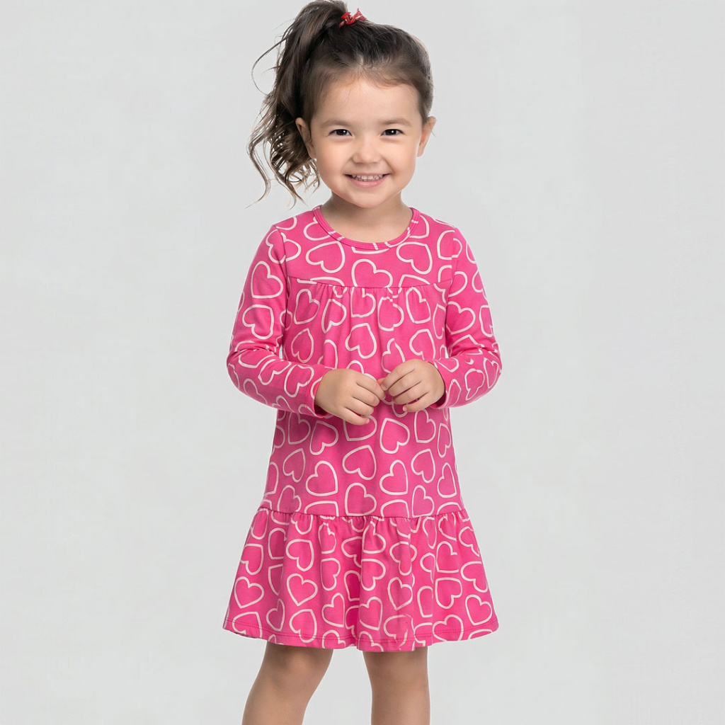 Dívčí šaty s dlouhým rukávem. Příjemný, měkký úplet s potiskem srdíček. Pohodlný střih. Vyrobeno v Brazílii.