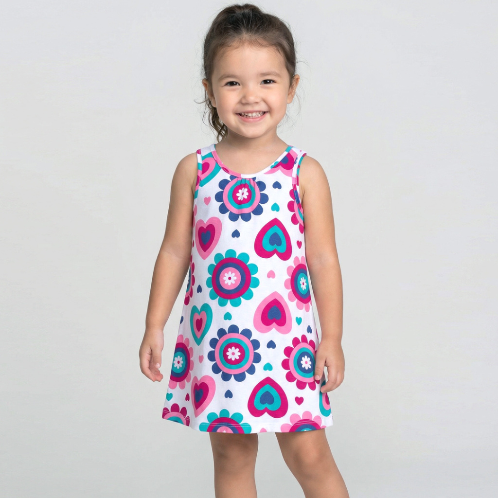 Krásné letní šaty bez rukávů. Kulatý výstřih s jemným nařesením. Pohodlný, mírně rozšířený střih. Bavlněný úplet s barevným potiskem. Vyrobeno v Brazílii.