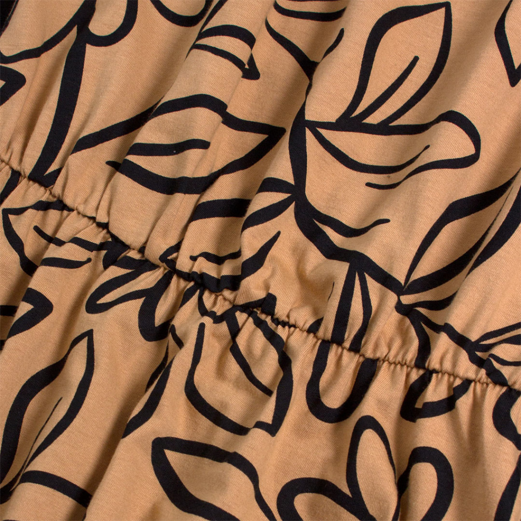 Dívčí krátké letní šaty. Rukávky lze stáhnout na ramena, krásně drží díky gumičce kolem výstřihu a ramínkům. Gumička v pase dotvoří siluetu. Bavlněný úplet s potiskem. Vyrobeno v Brazílii.