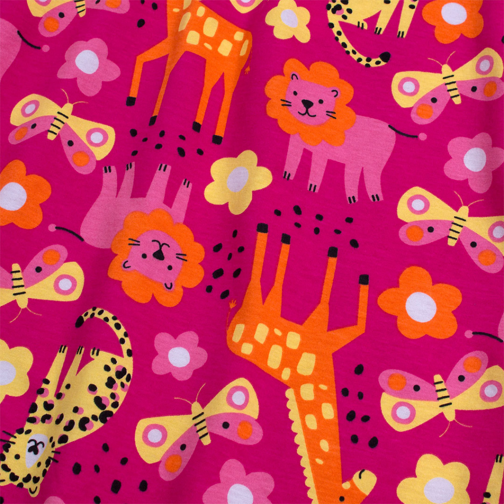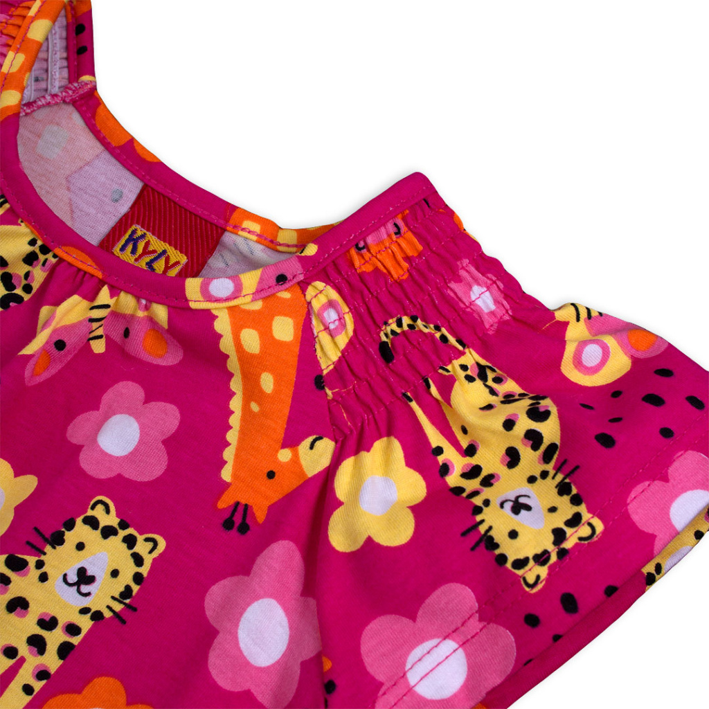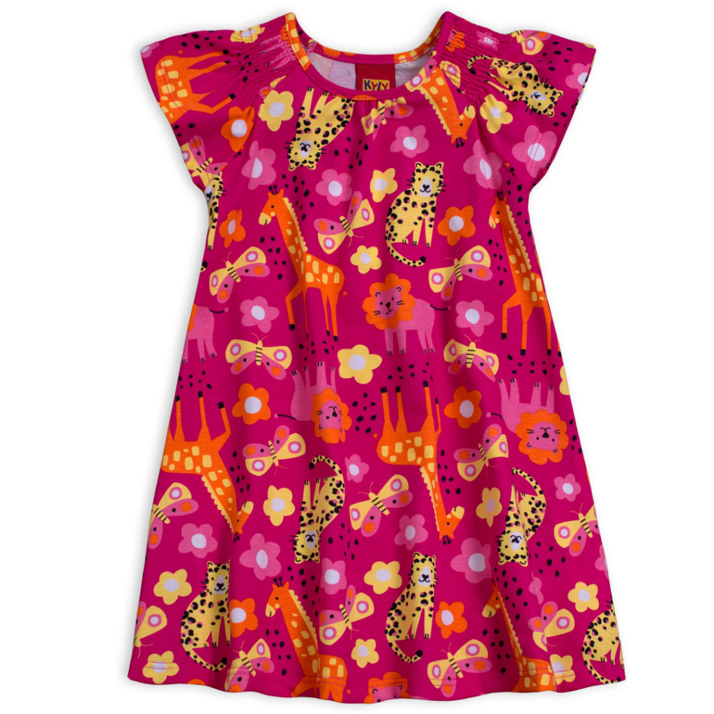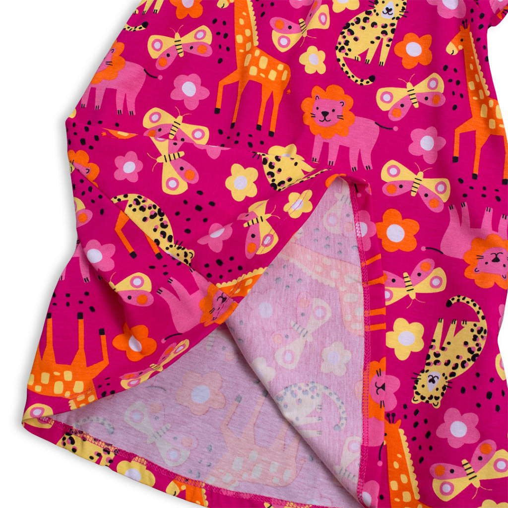Dívčí letní šaty s krásným potiskem zvířátek. Krátké rukávky se žabičkováním na ramenou. Pohodlný, rozšířený střih. Barevný potisk na bavlněném úpletu. Vyrobeno v Brazílii.