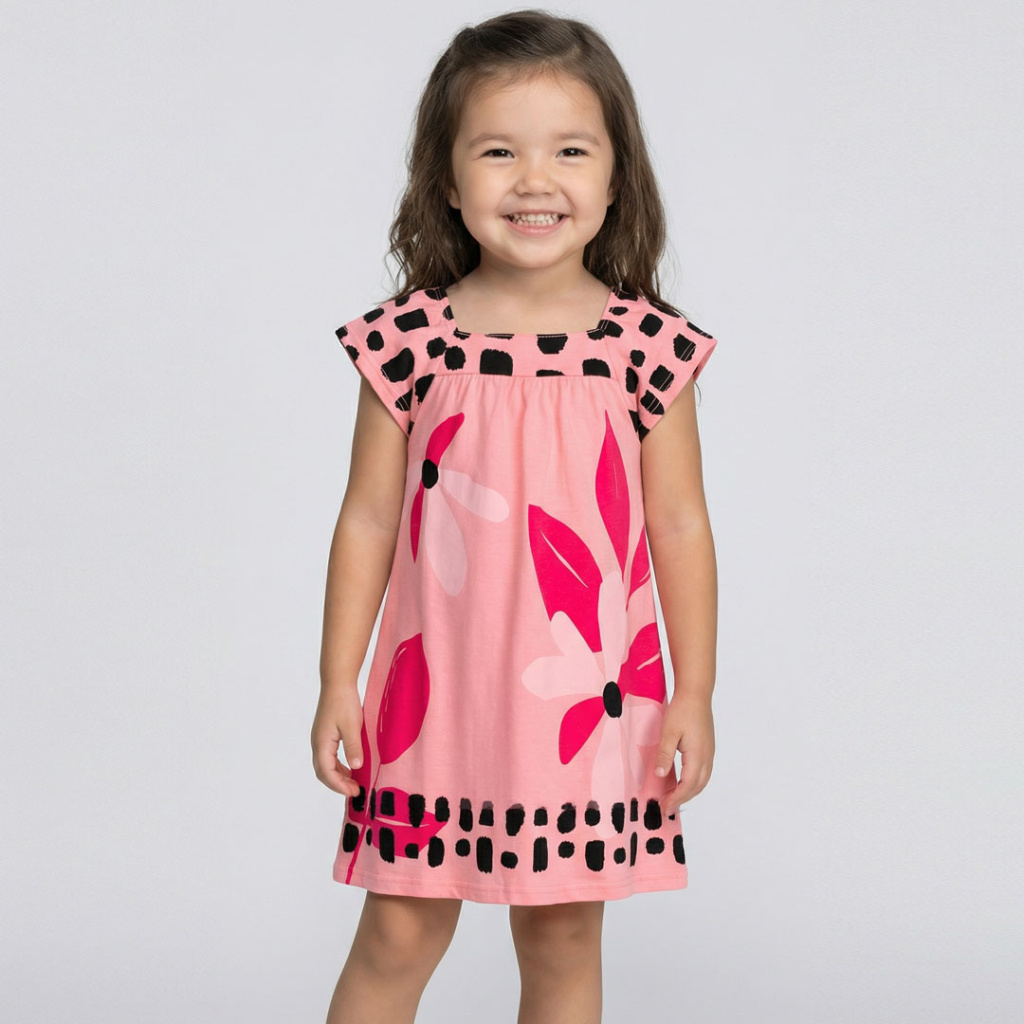 Dívčí letní šaty s krátkým rukávkem. Pohodlný, rozšířený střih. Příjemný bavlněný úplet s potiskem. Vyrobeno v Brazílii.