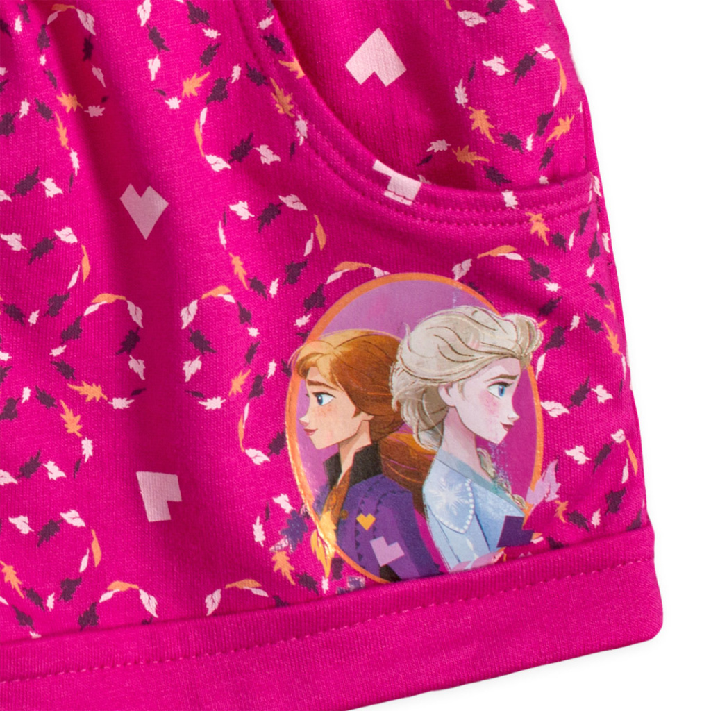 Dívčí šortky z lehké teplákoviny s potiskem z Ledového království. V pase širší guma, našitá ozdobná mašle. Funkční kapsy. Z rubu bez chloupku.