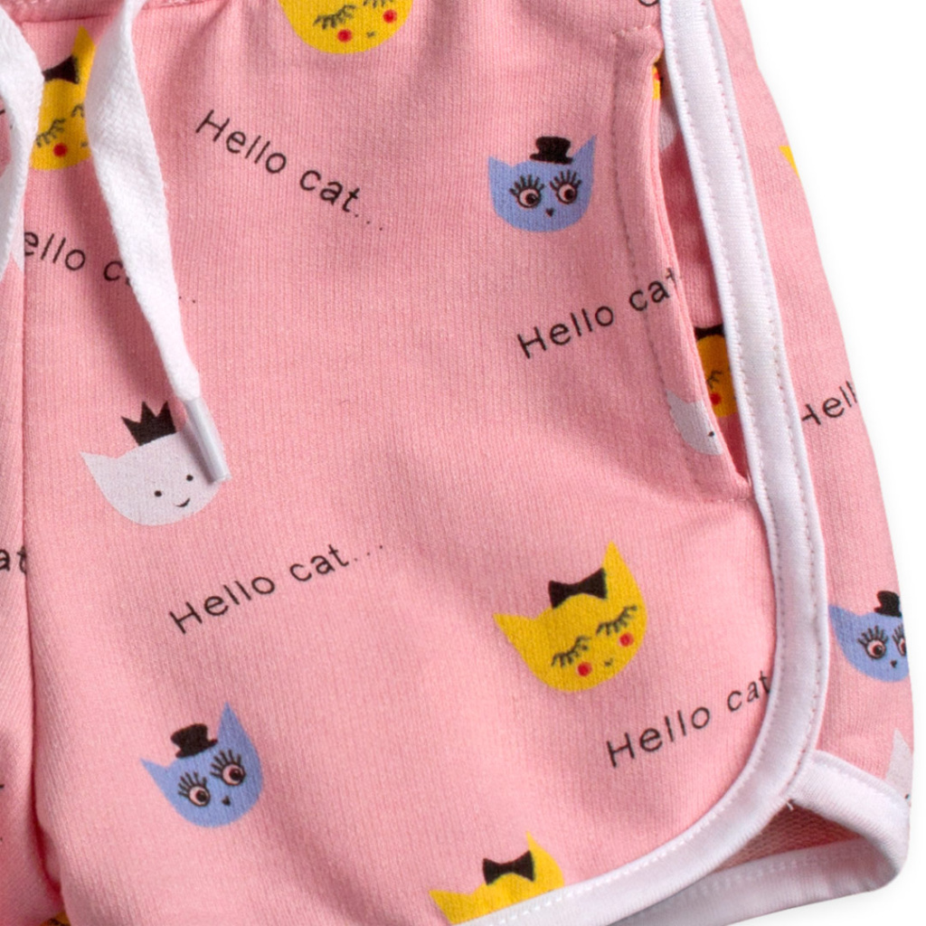 Dívčí kraťasy z pohodlného úpletu. Potisk kočiček. Funkční kapsy. V pase guma, tkanička na stažení.