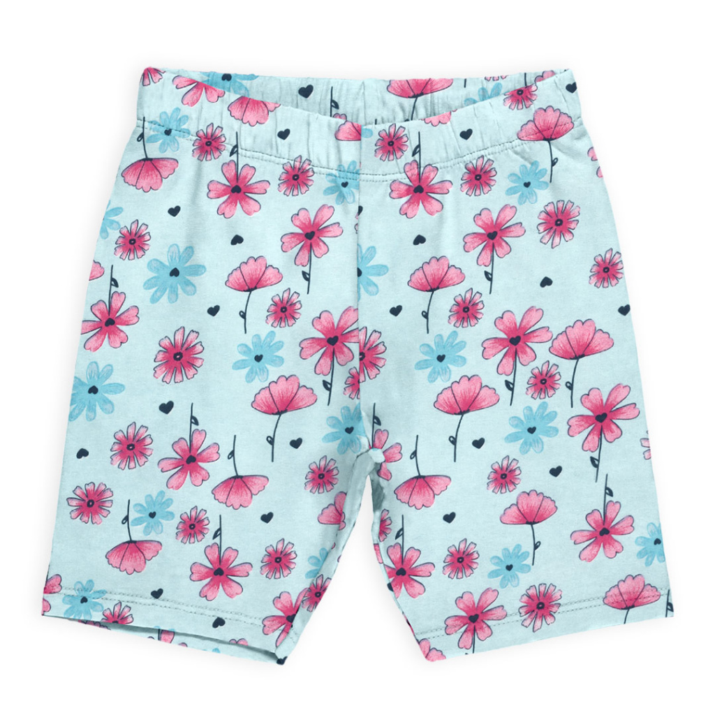 Dívčí letní souprava. Tričko s krátkým rukávem, se třpytivým potiskem. Šortky - krátké leginy s kytičkami. Příjemný bavlněný úplet. Vyrobeno v Brazílii.