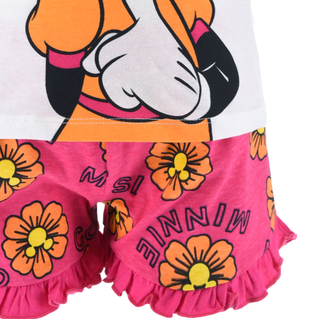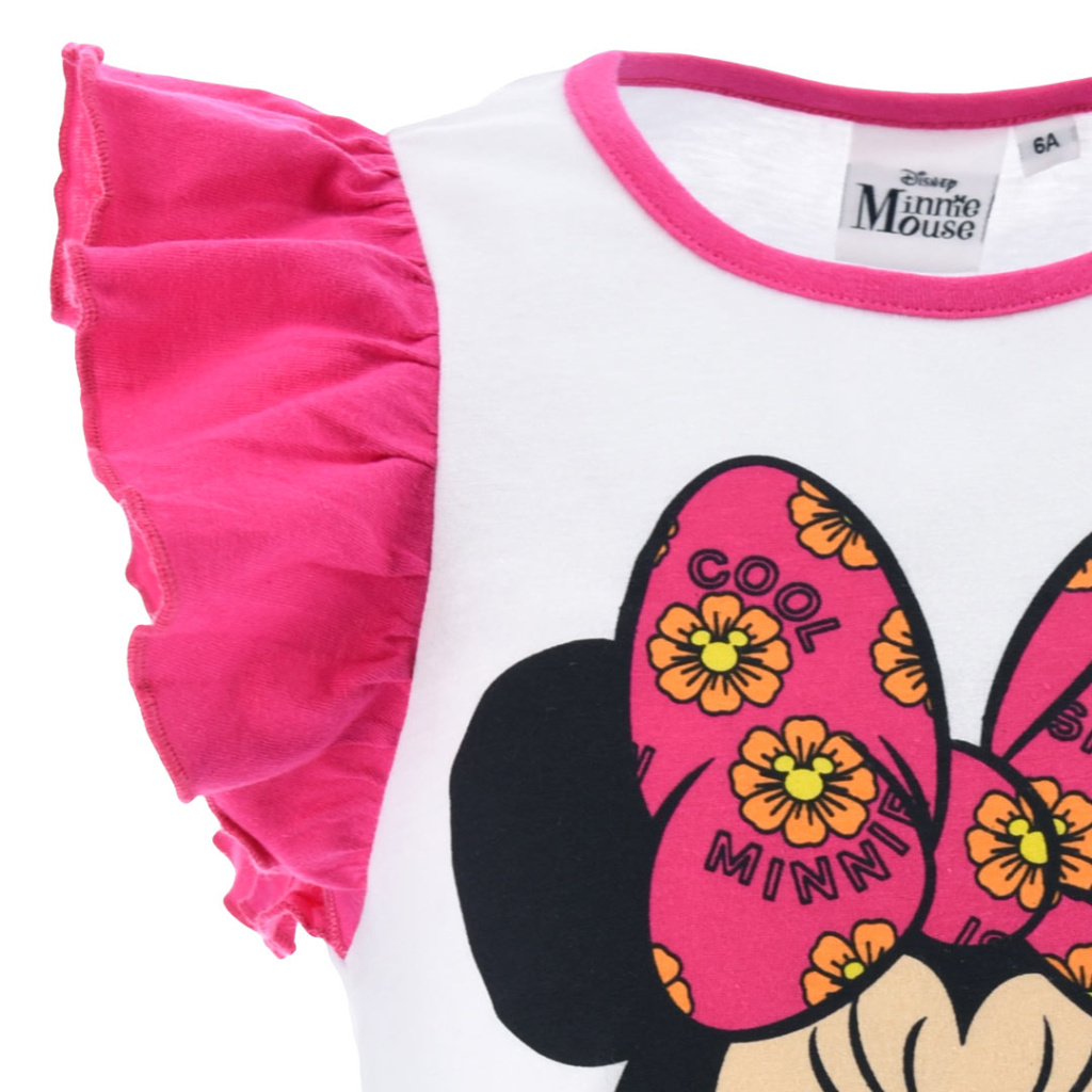Dívčí letní souprava s Minnie. Tričko s volánkovým rukávem, šortky s výrazným potiskem. Bavlněný úplet.