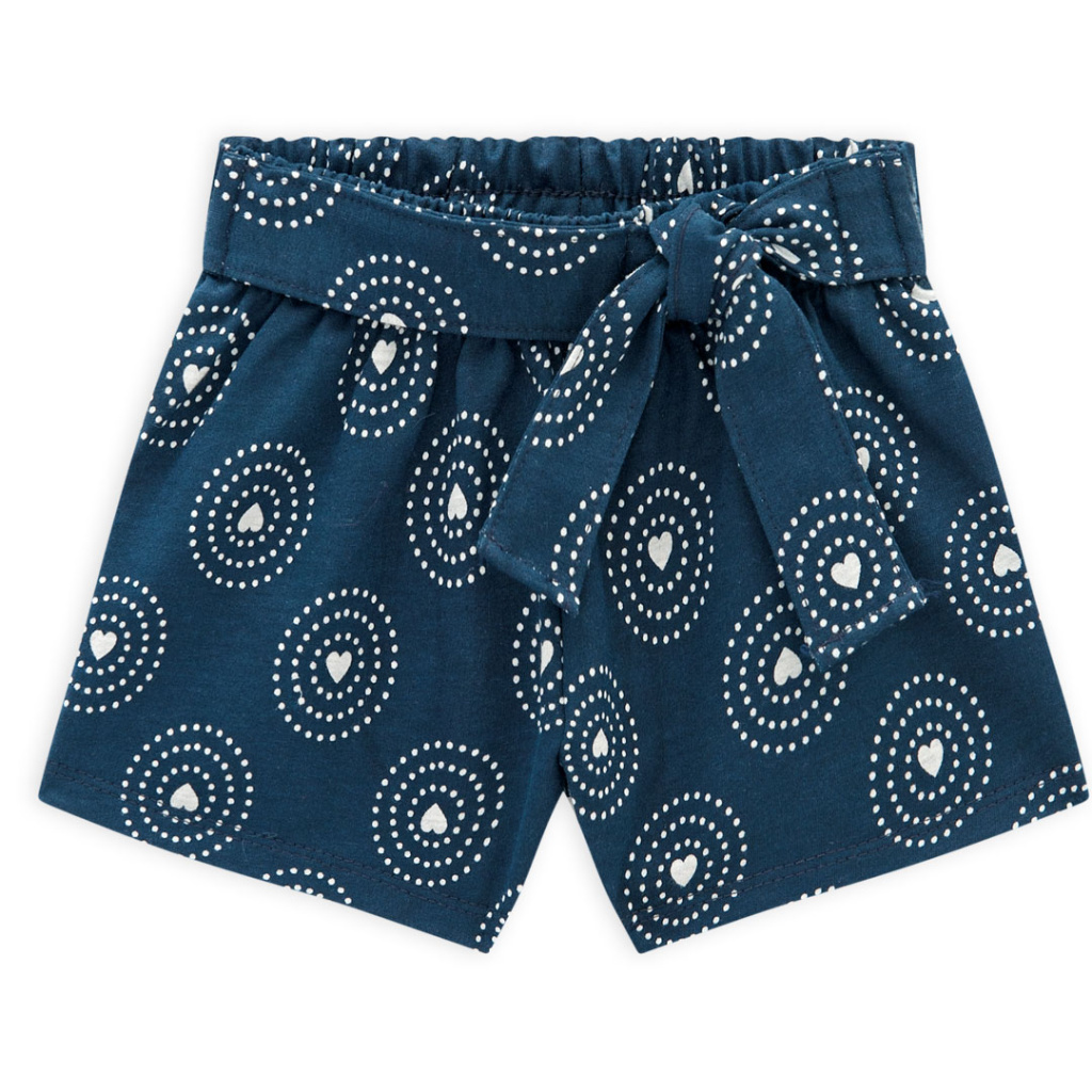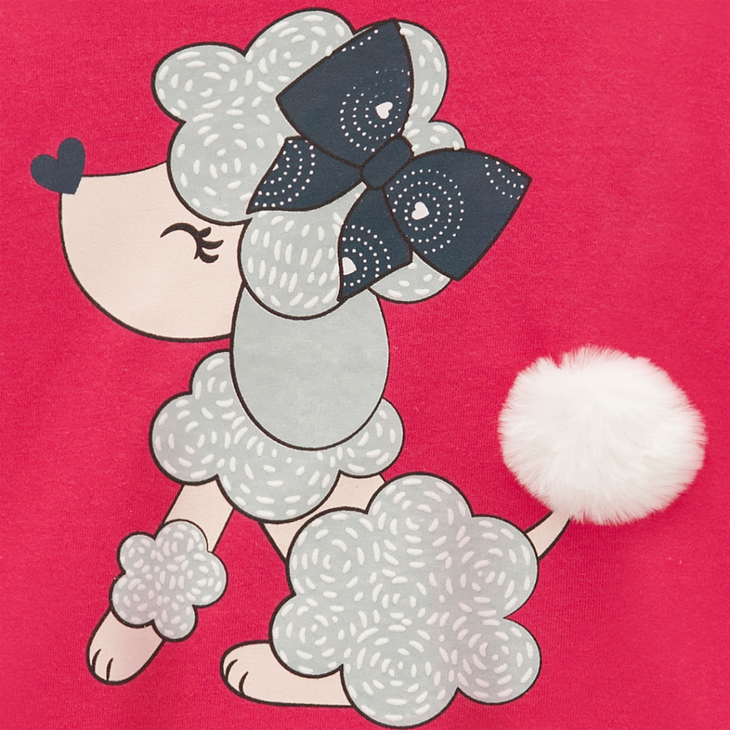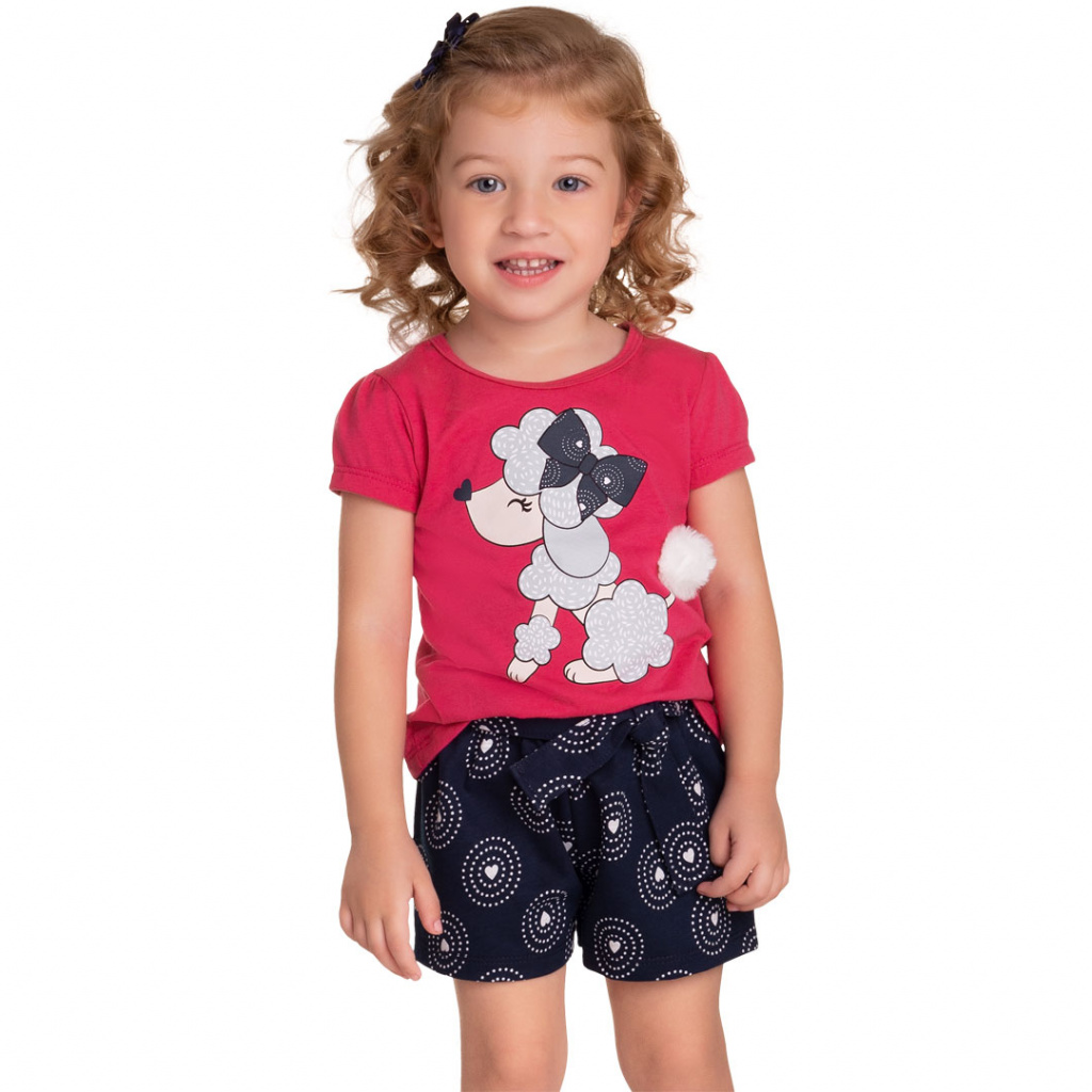 Letní souprava pro holčičky. Tričko s krátkým rukávem, s obrázkem pudlíka s chlupatou bambulkou na ocásku. Šortky v pase na gumu, s přišitým ozdobným páskem s uzlem. Vyrobeno v Brazílii.