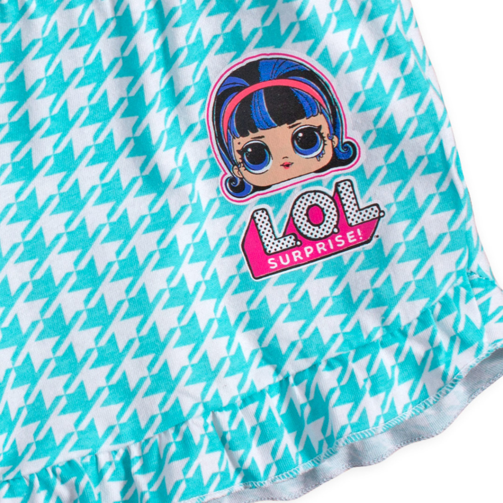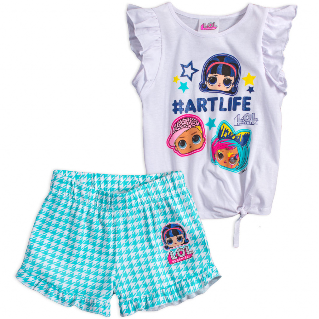 Dívčí letní komplet LOL SURPRISE. Tričko s volánkovým rukávkem, se zavázáním na uzel. Barevný potisk. Pohodlné šortky.
