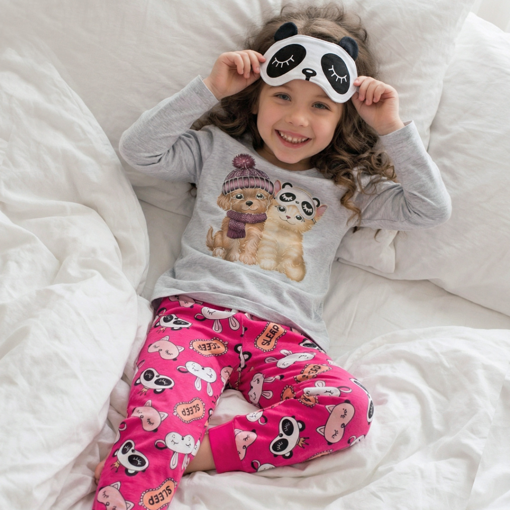 Dívčí pyžamo s maskou na spaní. Dlouhé rukávy i nohavice. Obrysy obrázku na tričku ve tmě svítí. Vyrobeno v Brazílii.