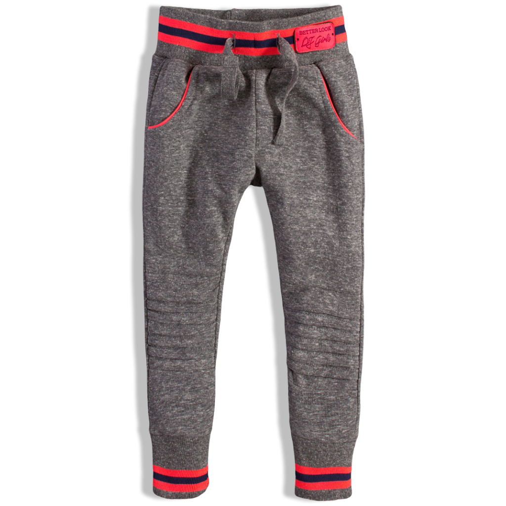 Dívčí tepláky. V pase širší guma, tkanička ozdobná. Po straně nášivka. Vpředu funkční kapsy. Prošití na nohavicích.