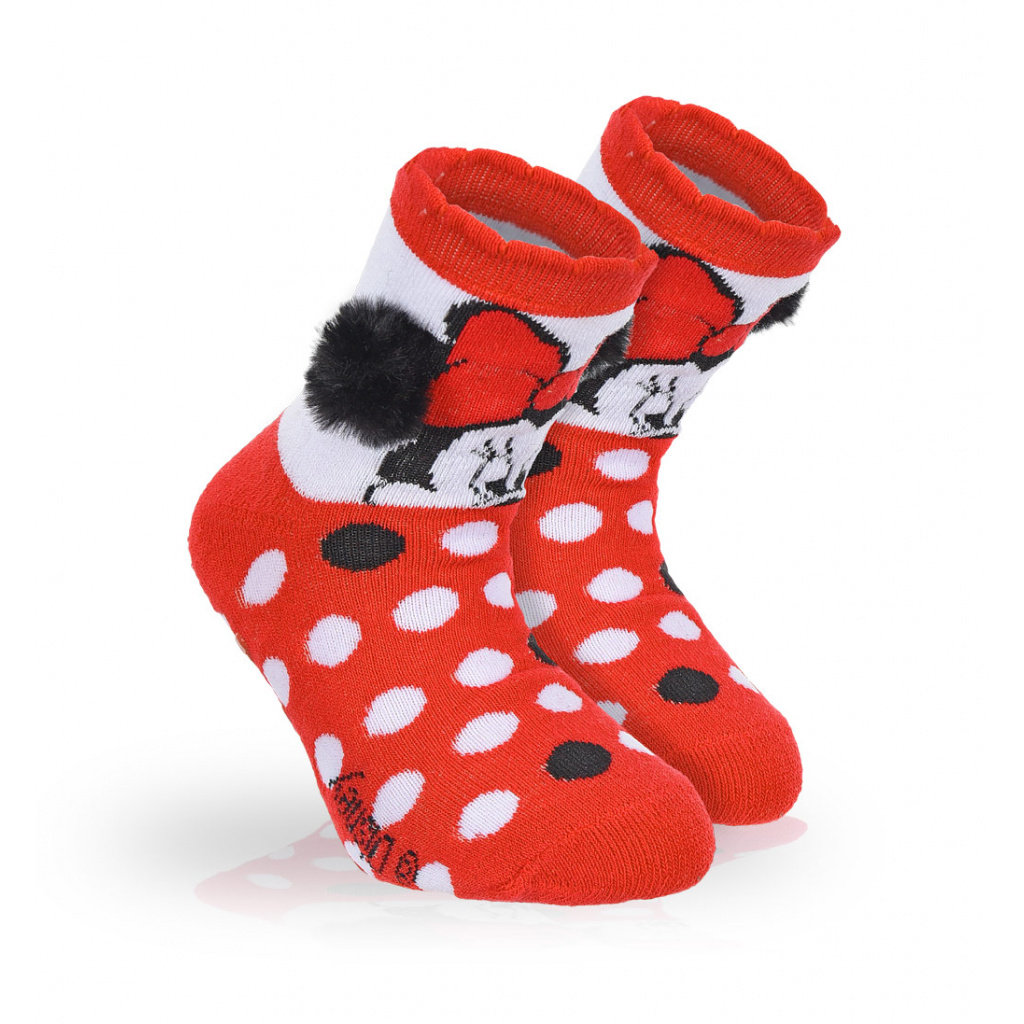 Dívčí ponožky s hřejivou vrstvou froté. Vypletený obrázek myšky Minnie, po stranách roztomilé chlupaté bambulky. Na chodidle drobný protiskluzový potisk.