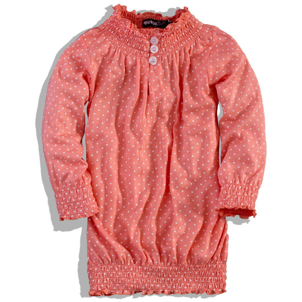 Dívčí top Dirkje. Delší střih. Potisk drobných hvězdiček. U krku zapínání na konflíčky. Okraje se žabičkováním. Velmi příjemný, lehký materiál.Doplňkové parametry