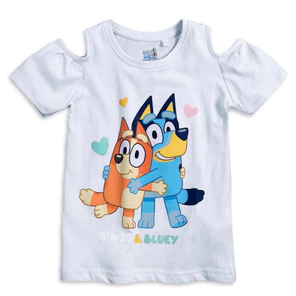 Dívčí tričko s animovanými kamarády Bingem a Bluey. Krátký rukáv s průstřihy na ramenou. Barevný potisk na bavlněném úpletu.