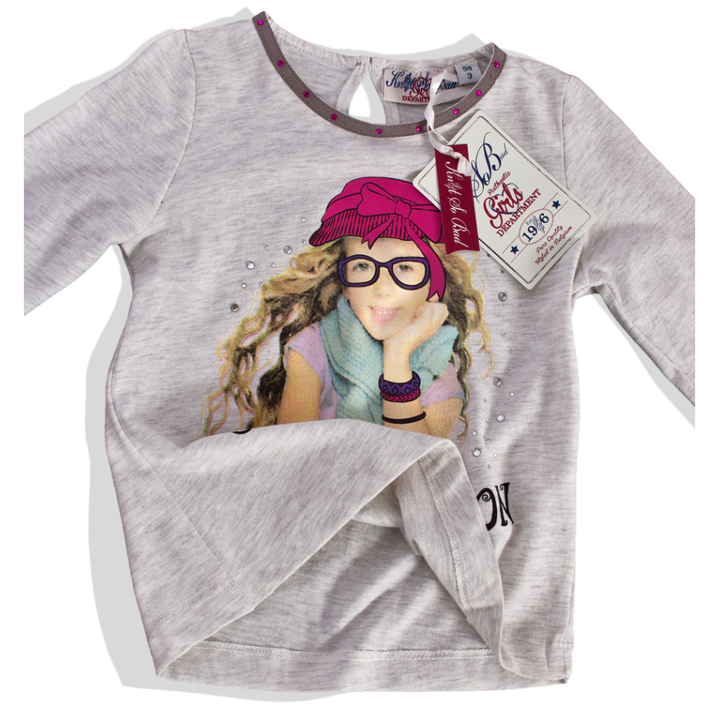 Dívčí tričko s dlouhými rukávy, s potiskem a ozdobnými kamínky. Vzadu u krku zapínání na jeden knoflíček.Doplňkové parametry