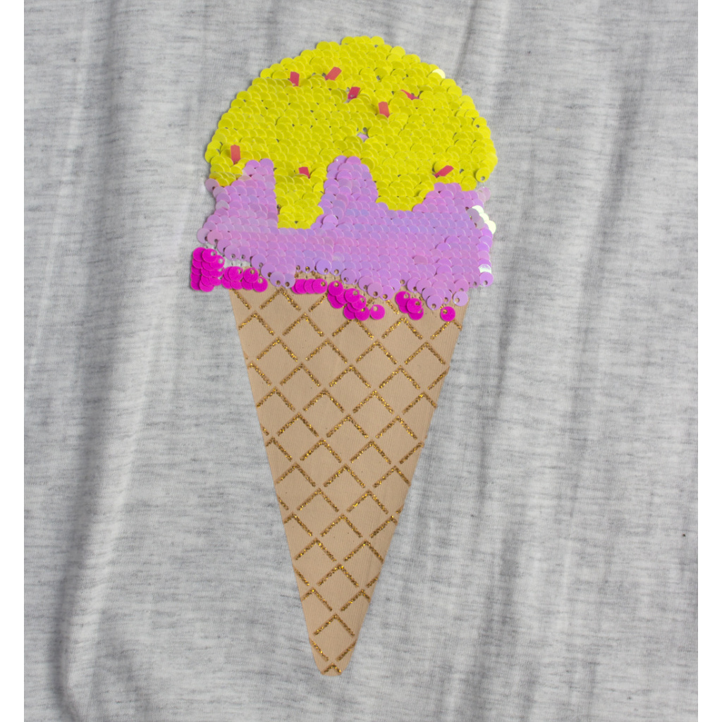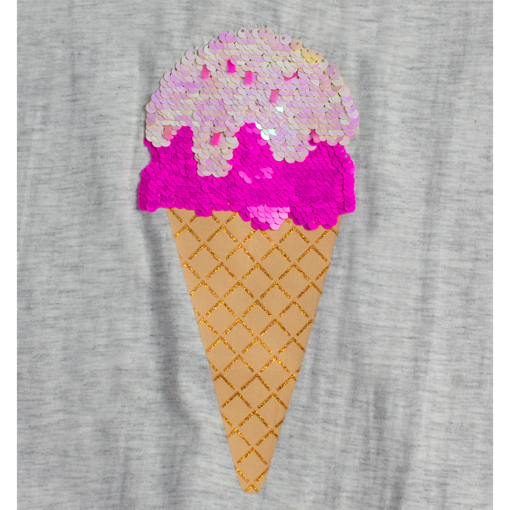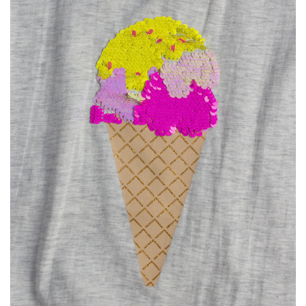 Slaďoučké tričko se sladkým motivem. Zmrzlina z překlápěcích flitrů mění barvu, kornout je zdobený třpytkami. Perfektní letní model z příjemného bavlněného úpletu.