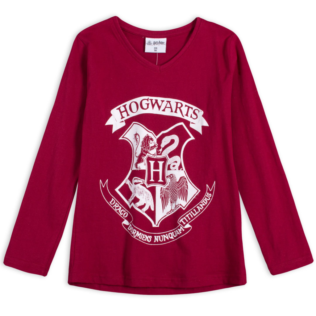 Dívčí tričko s dlouhým rukávem, se znaky kolejí kouzelnické školy v Bradavicích. Výstřih do V. Příjemný bavlněný úplet s bílým potiskem.