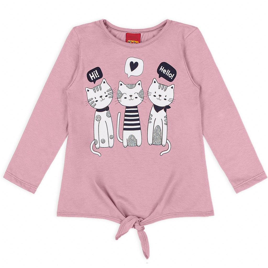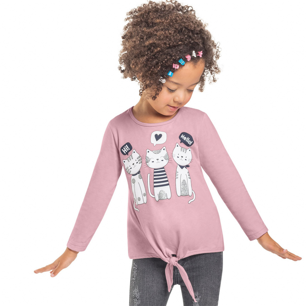 Dívčí tričko s dlouhým rukávem, s potiskem kočiček. Mírně rozšířený střih. Ozdobný uzel. Pružný bavlněný úplet. Vyrobeno v Brazílii.