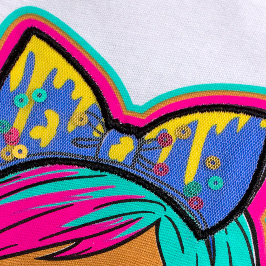 Dívčí tričko s krásně barevným potiskem L.O.L.SURPRISE. Spadlé rukávky s přišitým ohrnutím. Našitá mašlička s pohyblivými flitry. Příjemný, pružný úplet.