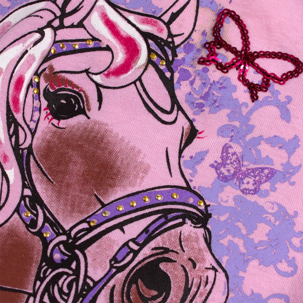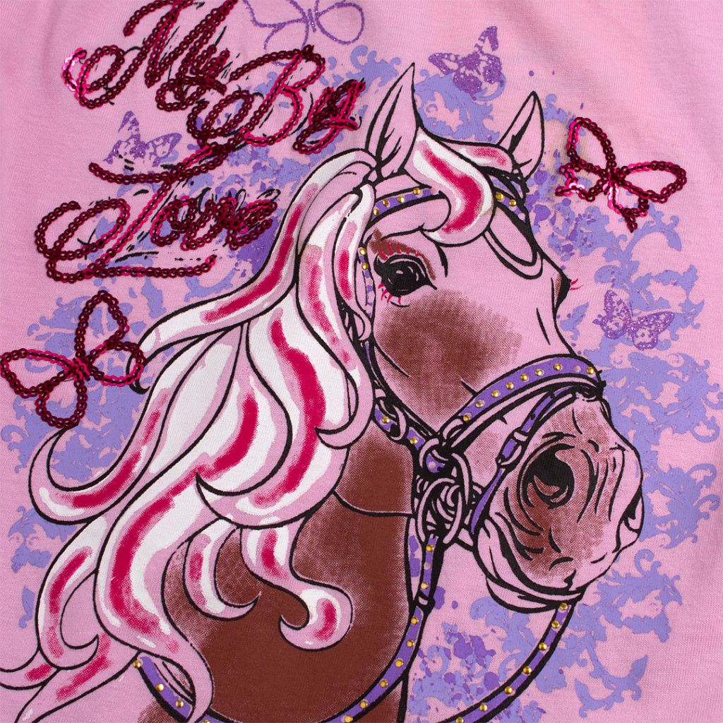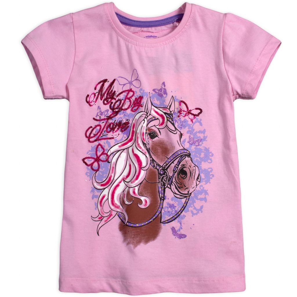 Dívčí tričko s krátkým rukávem. Pružný jednobarevný úplet s barevným obrázkem koně, zdobený flitry.