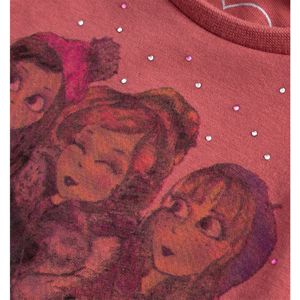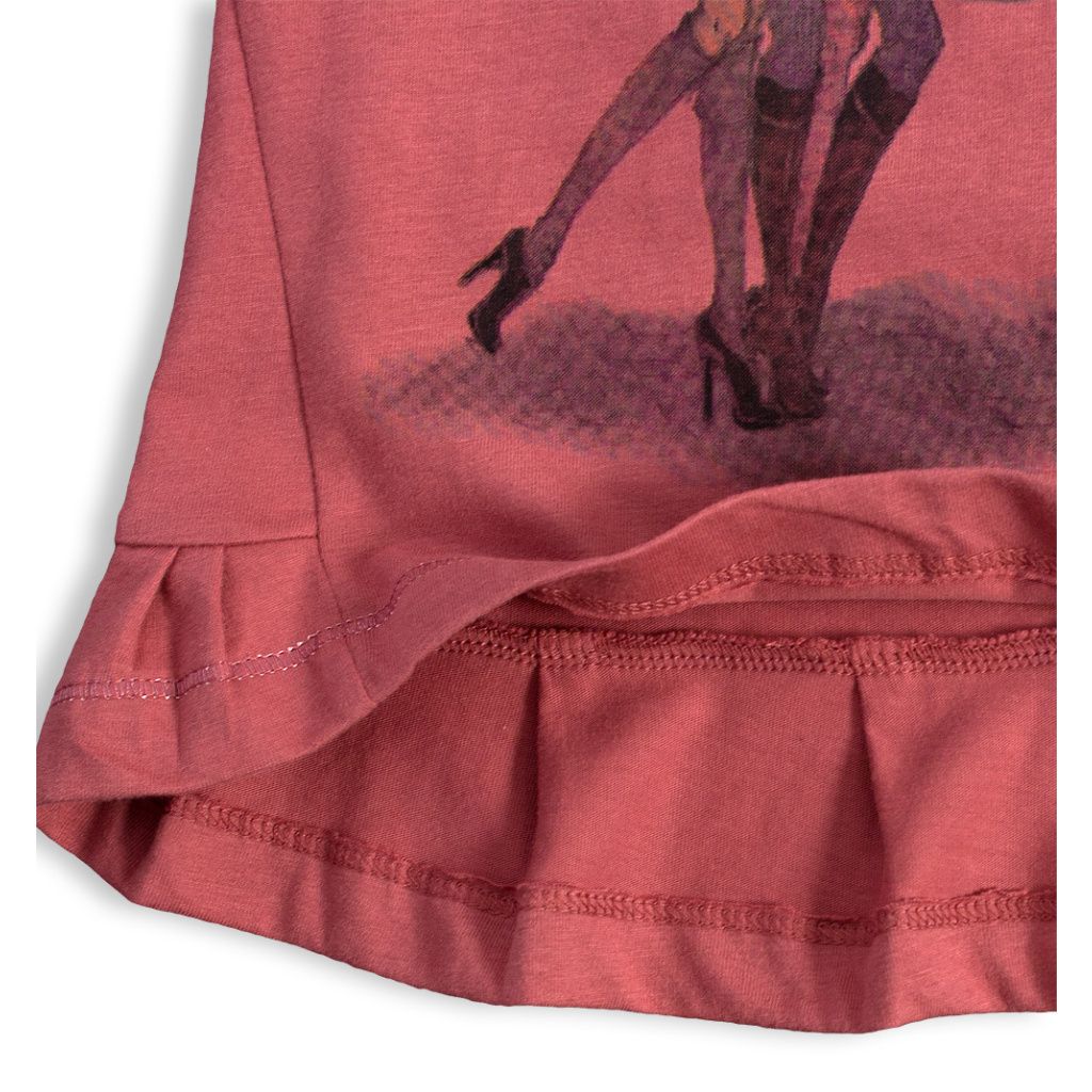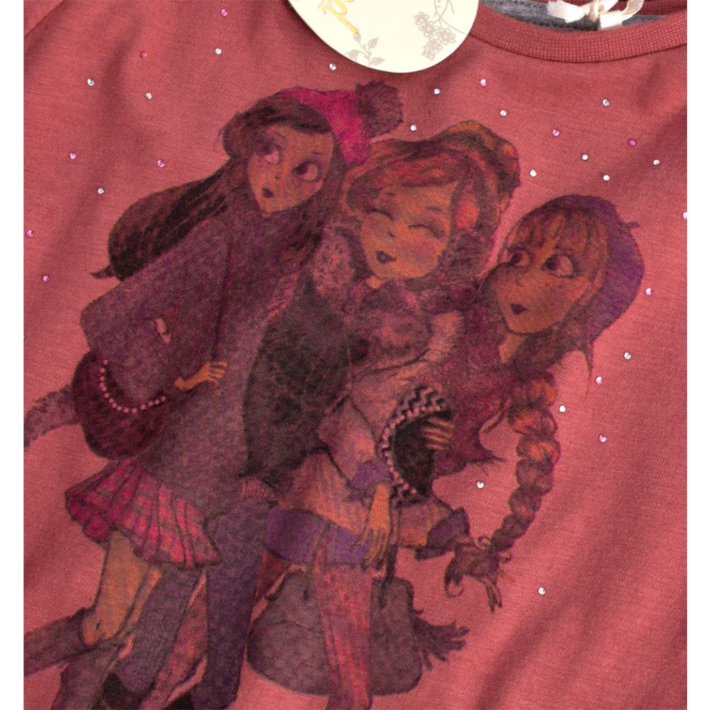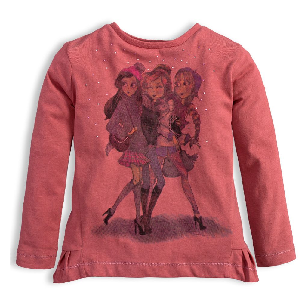 Dívčí triko s dlouhým rukávem. Vpředu potisk a barevné kamínky. Zadní díl prodloužený díky našitému volánku. Silnější bavlněný úplet, příjemný na dotyk.Doplňkové parametry