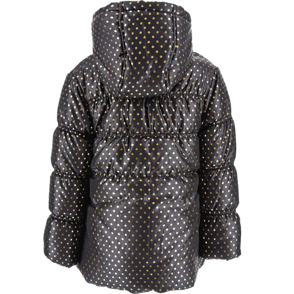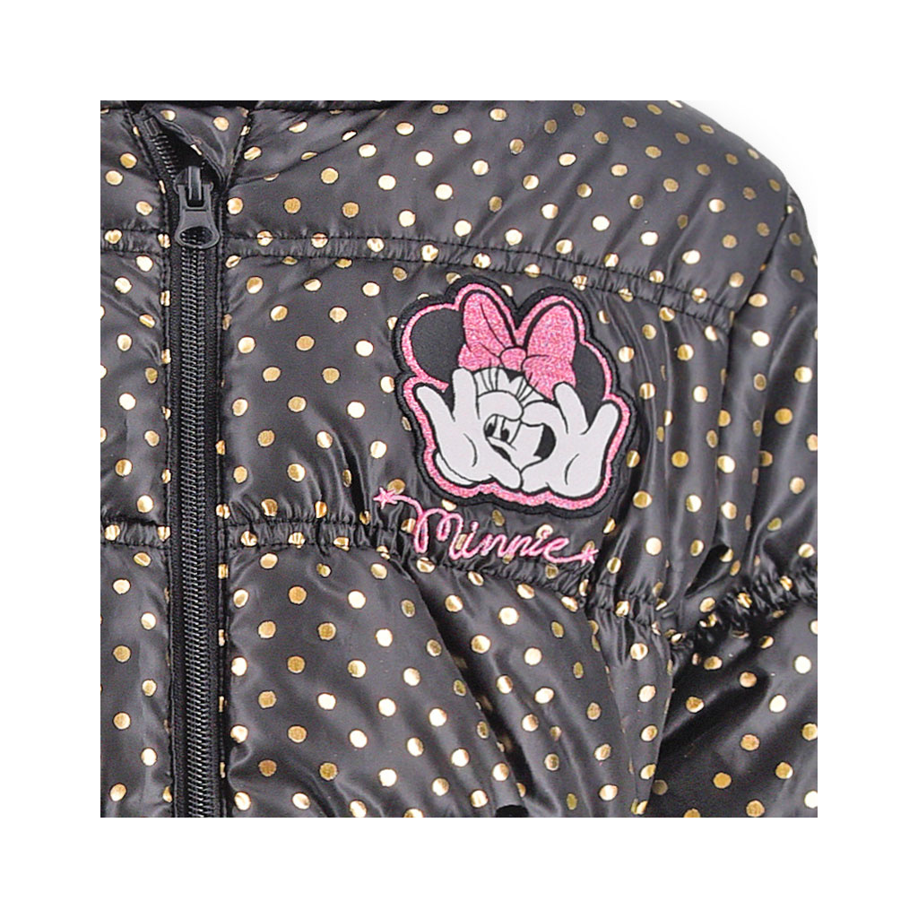 Krásná dívčí zimní bunda s myškou Minnie. Zdobená nášivkou a zlatými puntíčky. S kapucí, zapínání na zip, možnost stažení stuhami. Rukávy mají pružný lem. Na bocích všité kapsy. Po těle hřejivá fleecová podšívka, v rukávech šusťák.