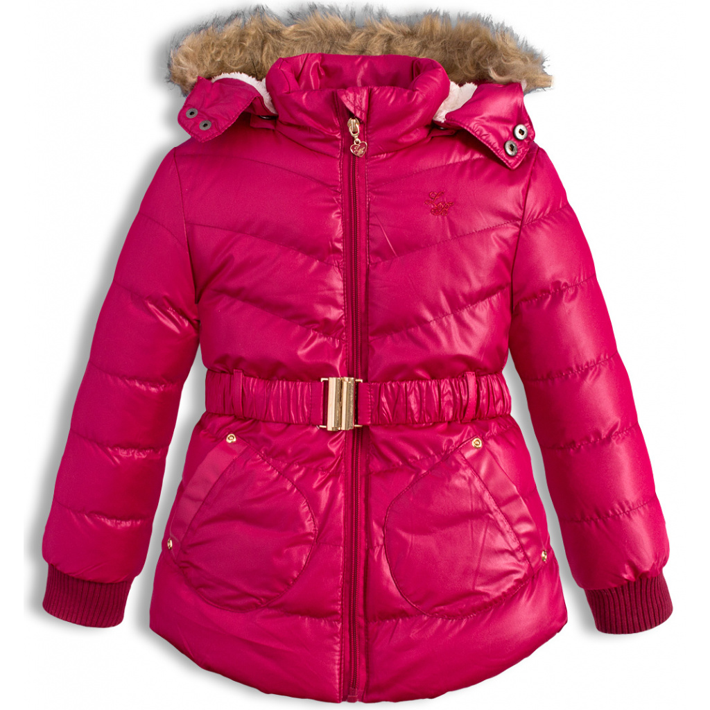 Dívčí zimní bunda s páskem. Odepínací kapuca podšitá jemným kožíškem. Našité kapsy. Na rukávech pružné lemy. Stojáček u krku. Uvnitř fleecová podšívka. V rukávech šusťák.