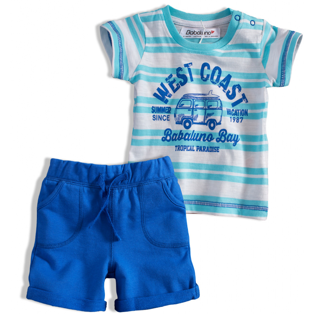 Letní set - tričko s krátkým rukávem, s potiskem. Zapínání na rameni na patenkty. Úpletové kraťasy v pase na gumu, tkanička ozdobná. Našité kapsy. Přišité ohrnutí nohavic.Doplňkové parametry