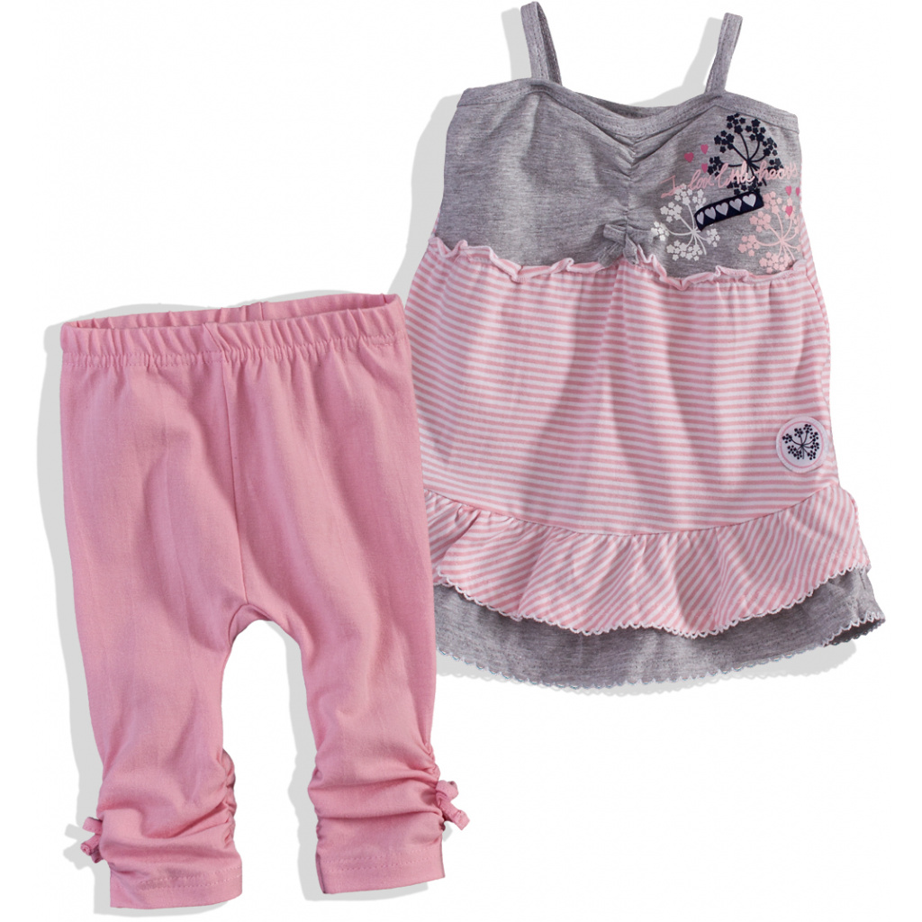 Kojenecký komplet DIRKJE - šatičky na ramínka, vpředu nabrané, s potiskem, na spodním okraji volány. Leginy s nařasenými nohavicemi a našitou mašličkou.Doplňkové parametry