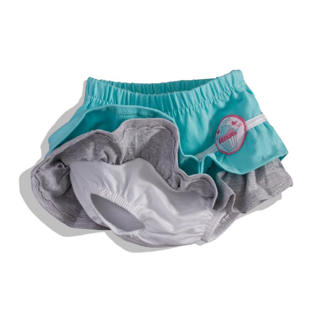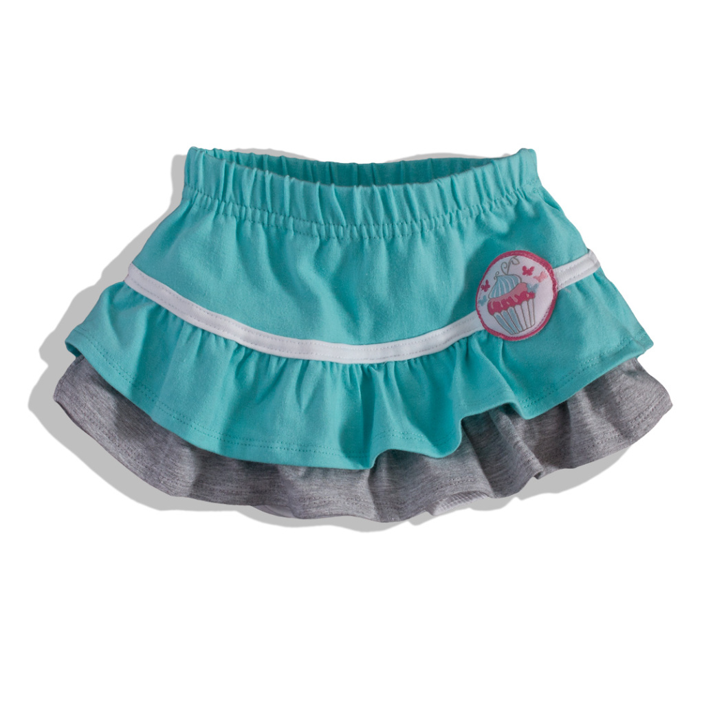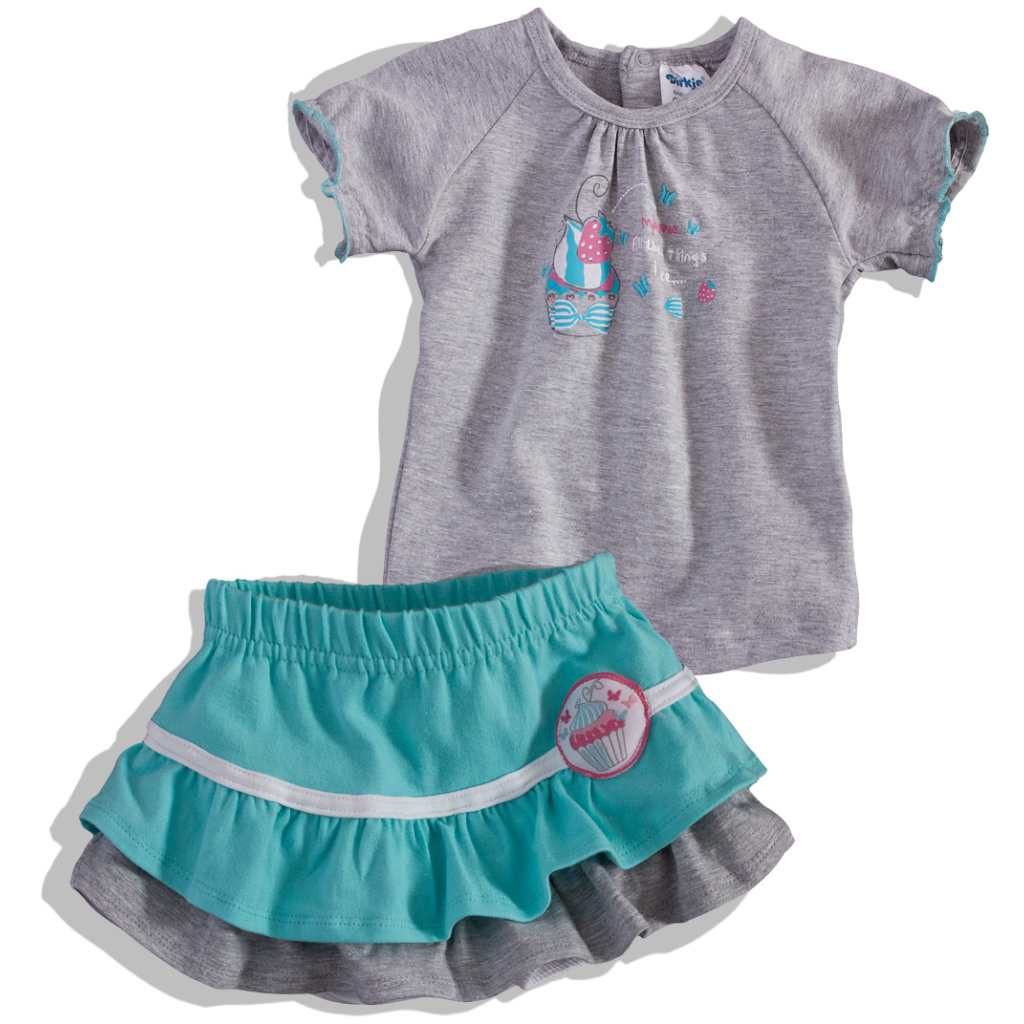 Kojenecká dívčí souprava. Sukýnka s volánky a malou nášivkou, se všitými kalhotkami. Tričko s potiskem, rukávky do jemné, nesvíravé gumičky. Zapínání vzadu na patentky. Měkký elastický bavlněný úplet.Doplňkové parametry