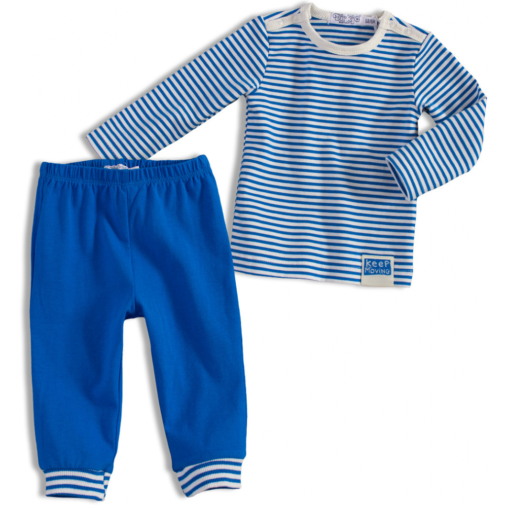 Kojenecký set trika a tepláků. Triko z proužkovaného úpletu, zapínání na ramenou. Dole malá nášivka. Tepláčky v pase na gumu, nohavice s pružným nápletem. Z rubu bez chloupku.Doplňkové parametry