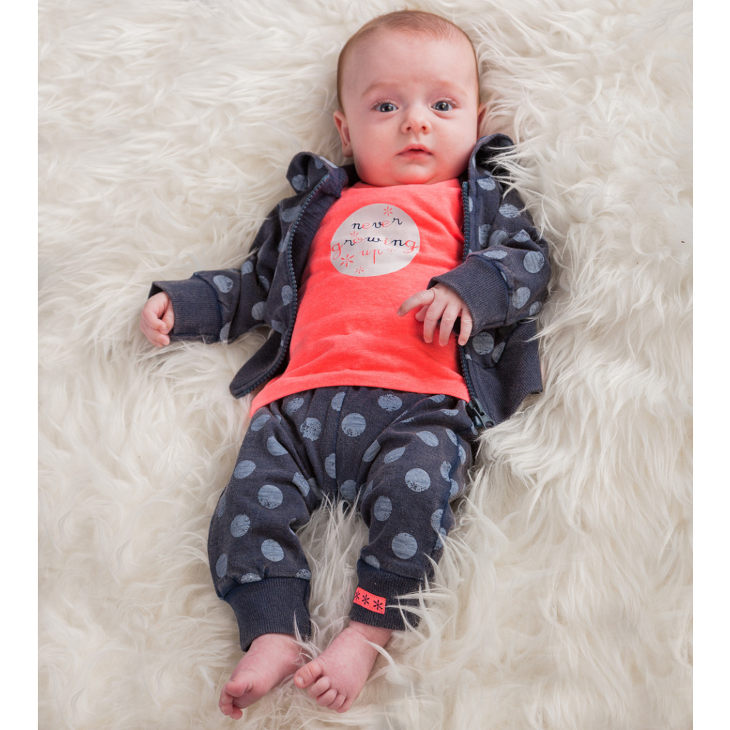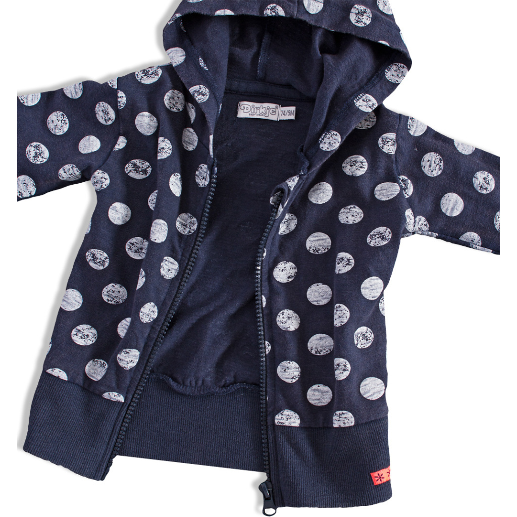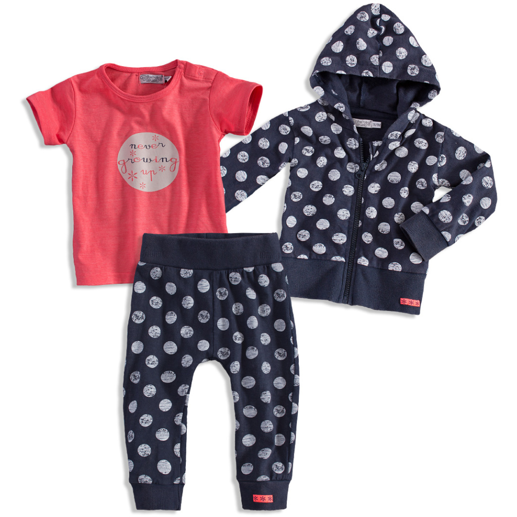 Mikina na zip, s kapucí. Kalhoty v pase na gumu. Bavlněný úplet, z rubu bez chloupku, potisk puntíků. Tričko s krátkým rukávem, s potiskem. Zapínání na rameni. Příjemný melírovaný úplet.