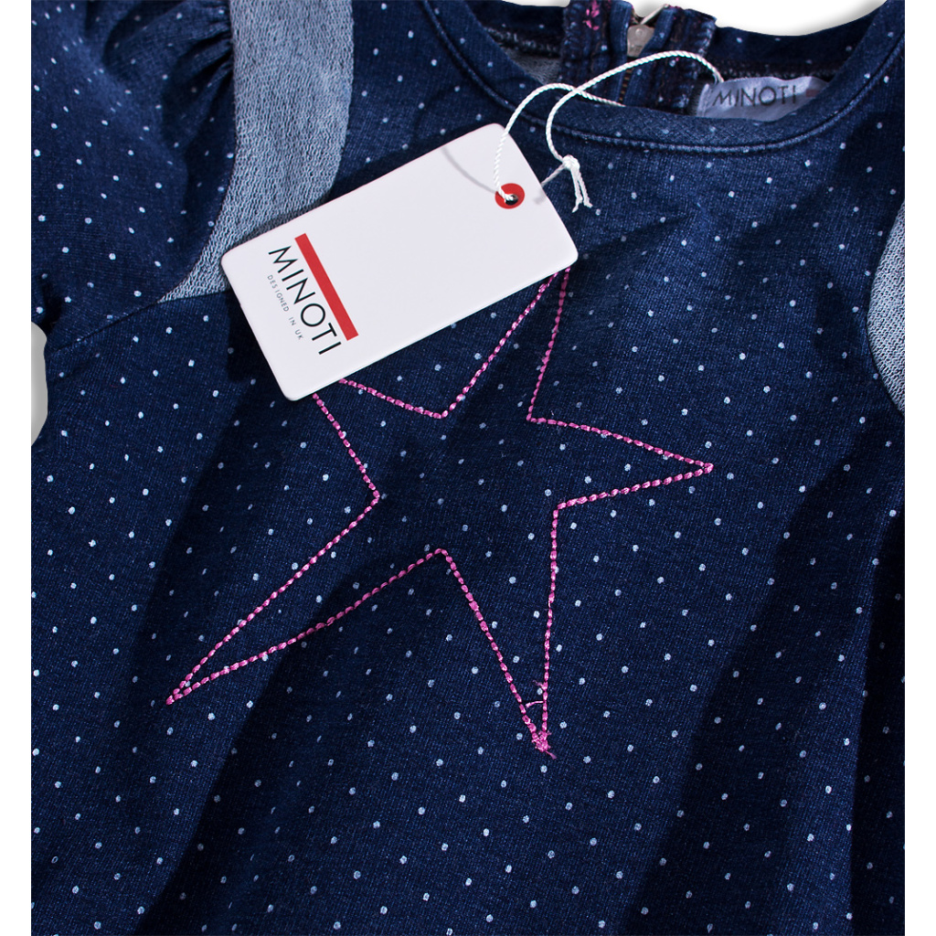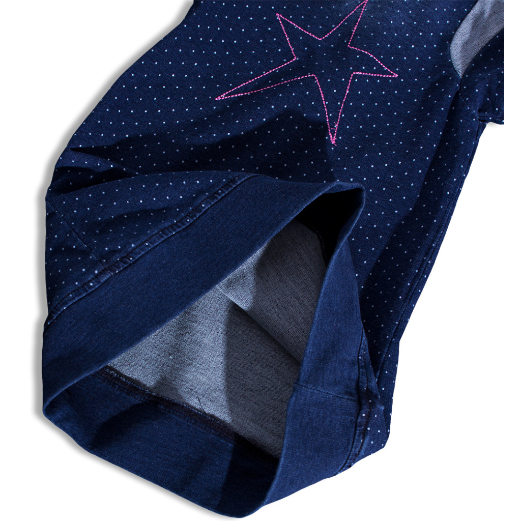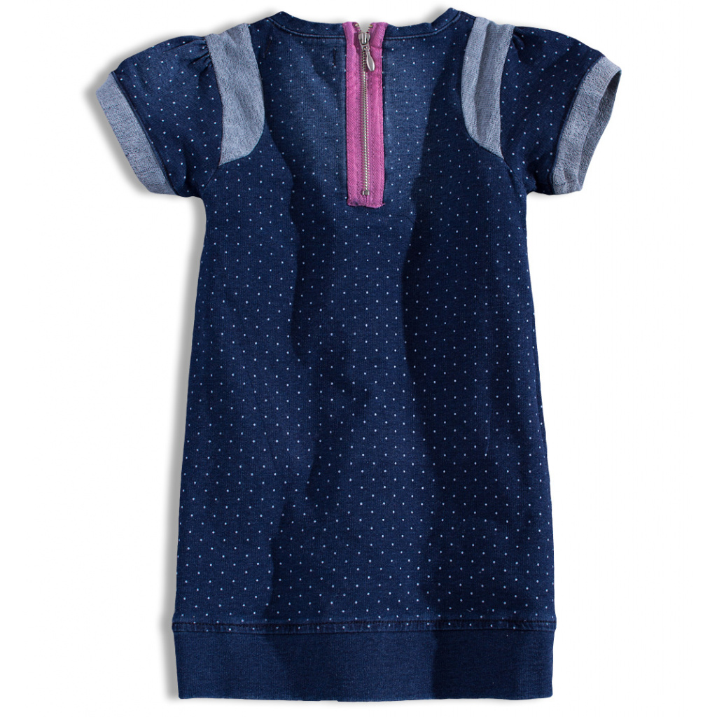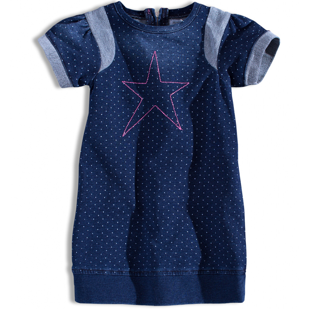 Kojenecké dívčí šaty ze silnějšího úpletu džínového vzhledu. Vpředu vyšitá hvězda, zajímavé detaily na rukávech. Potisk malých puntíčků. Vzadu krátký zip pro snadnější oblékání.