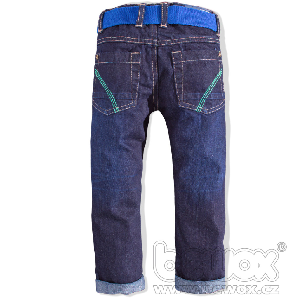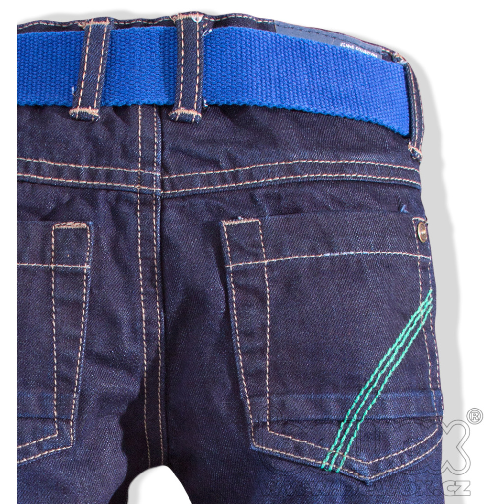 Chlapecké rifle s páskem. Barevné prošívání, nášivky, ohrnuté nohavice. Volný střih. Zapínání na zip, v pase nastavitelná guma.Doplňkové parametry