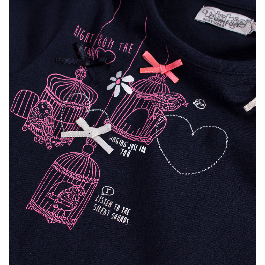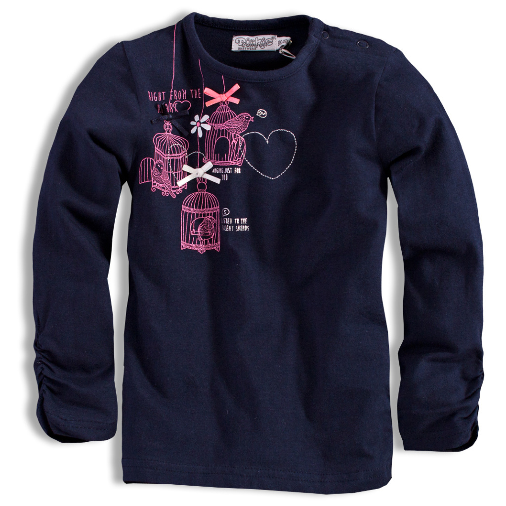 Dívčí triko s dlouhým rukávem. Potisk a našité mašličky. Zapínání na rameni na patentky do velikosti 86. Nařasené rukávy. Příjemný elastický úplet.Doplňkové parametry