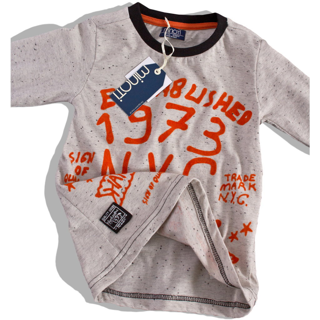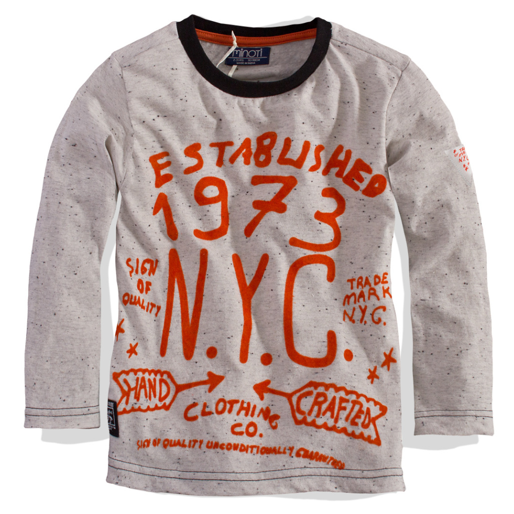 Chlapecké triko s dlouhým rukávem od anglické značky Minoti. Příjemný úplet s módními žmolky. Plastický, sametový potisk, nášivka na rameni a u pasu.
