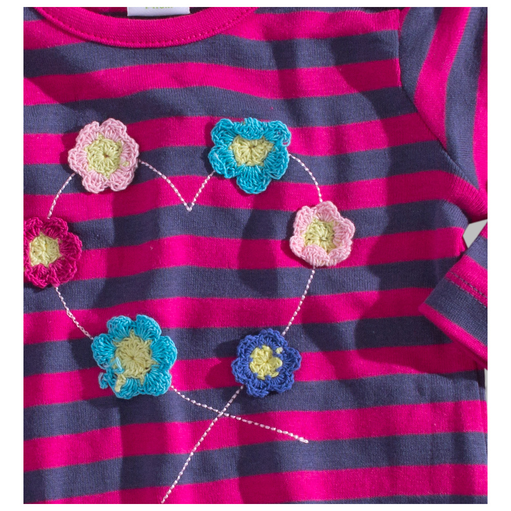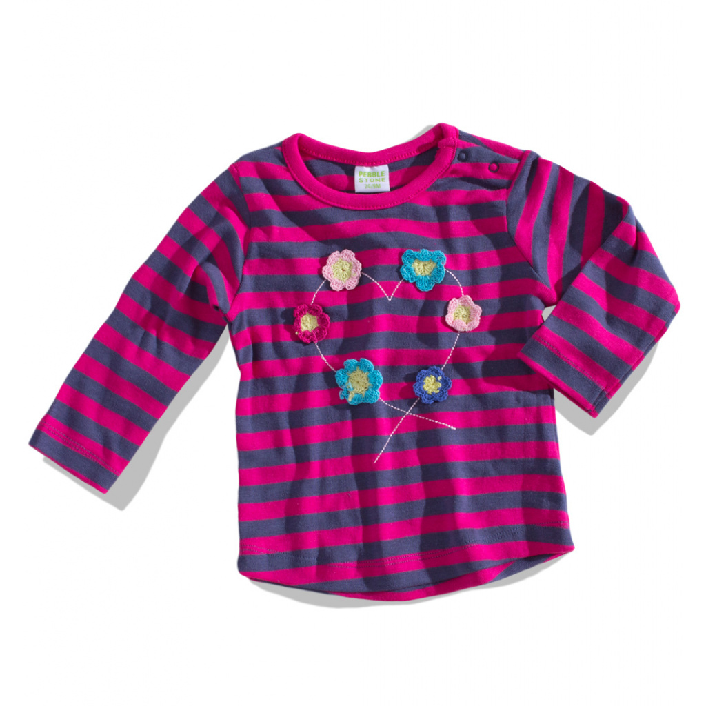 Kojenecké dívčí tričko s dlouhým rukávem. Našité háčkované kytičky. Zapínání na rameni nma patentky. Bavlněný proužkovaný úplet.
