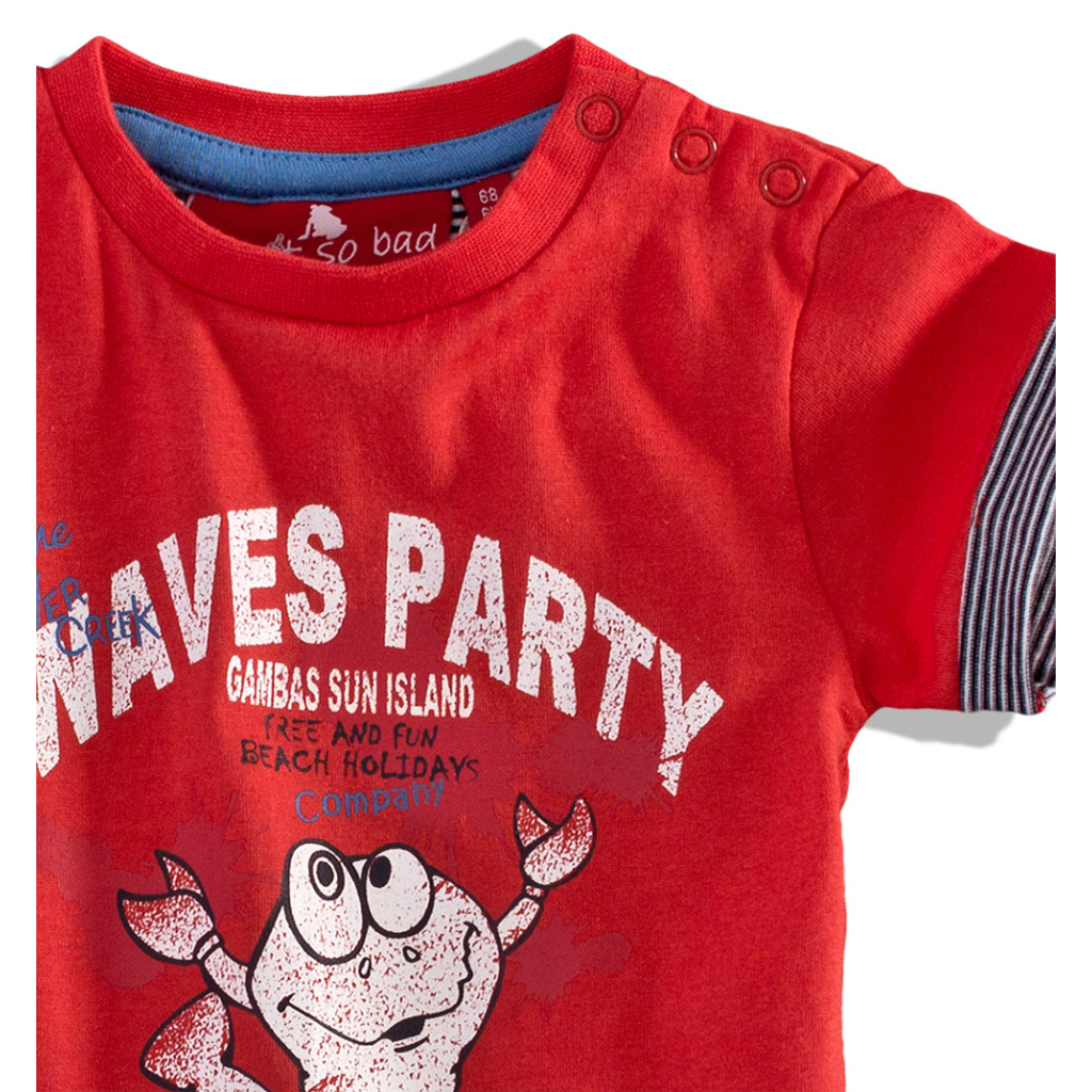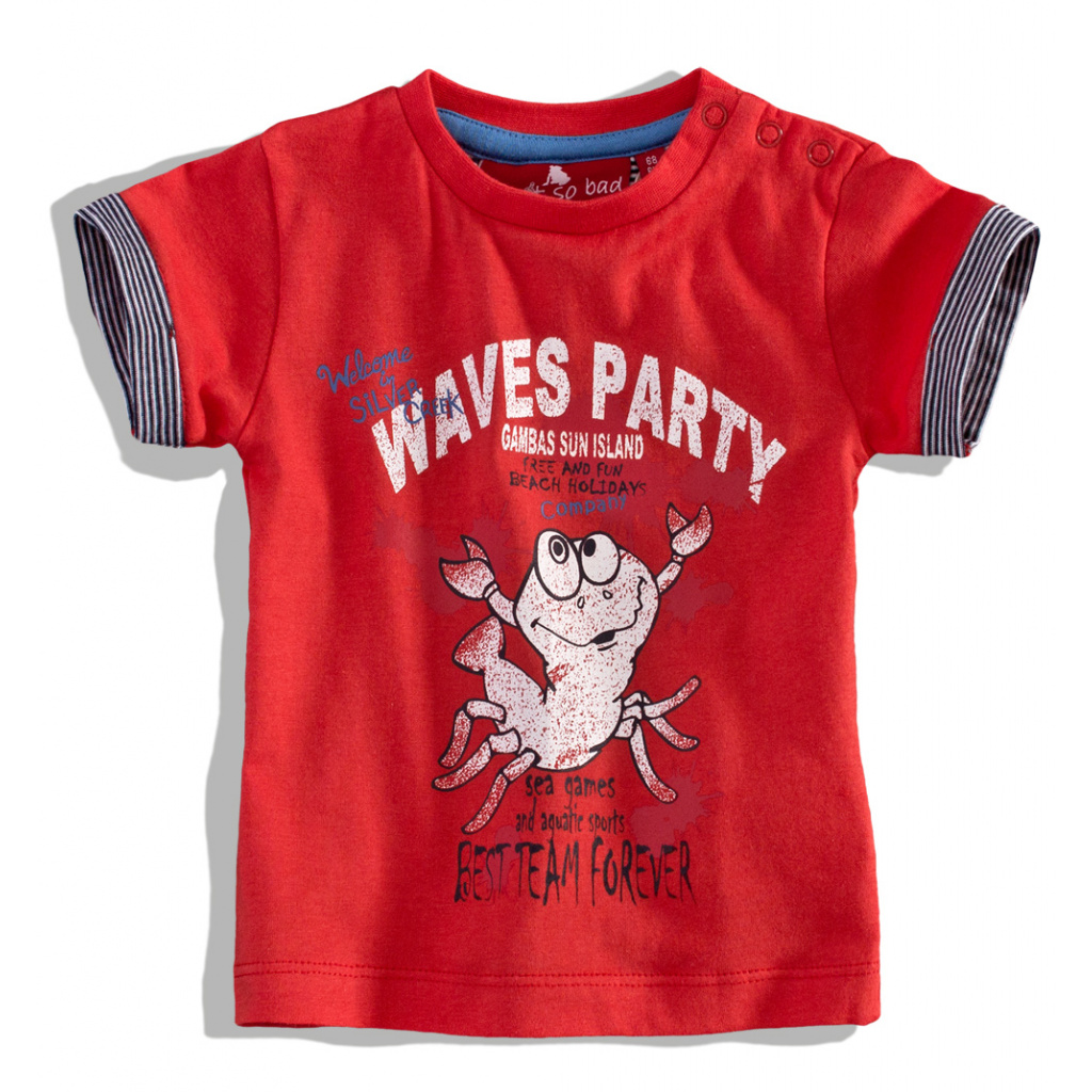 Kojenecké tričko s krátkými rukávy. Potisk na předním dílu, ohrnuté lemy rukávů. Zapínání u krku na patentky.Doplňkové parametry
