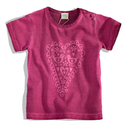 Kojenecké tričko pro holčičky. Krátký rukáv, na rameni zapínání na ozdobné patenty. Vpředu potisk. Holandská značka PEBBLESTONE.Doplňkové parametry