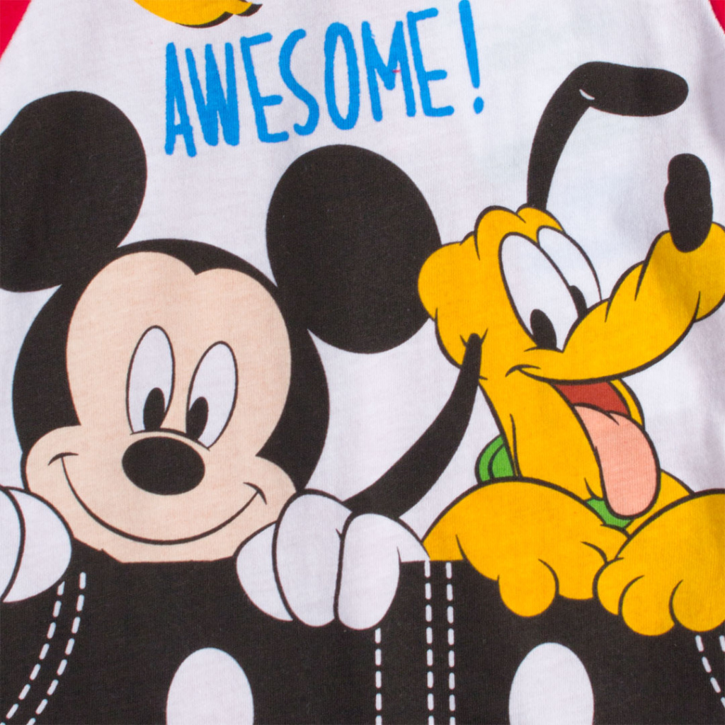 Dětský overal s krátkým rukávem a nohavičkami. S Mickey Mousem a Plutem. Pohodlný bavlněný úplet. Zapínání na patentky.