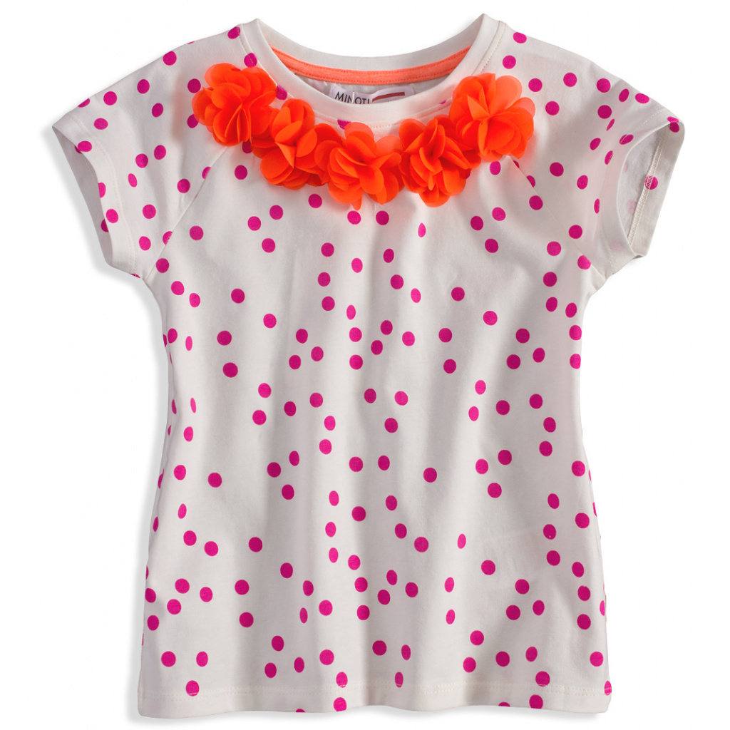 Dívčí tričko, krátký raglánový rukáv. Pružný úplet s potiskem puntíků. U výstřihu našité kytičky.